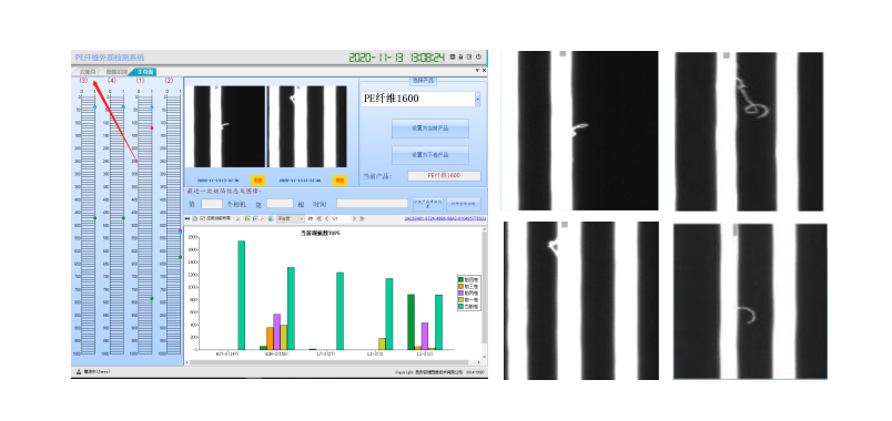 基于機(jī)器視覺(jué)技術(shù)研發(fā)的PE纖維在線檢測(cè)系統(tǒng)(超高分子量聚乙烯纖維檢測(cè)系統(tǒng)),可實(shí)時(shí)在線檢測(cè)每一根纖維上的毛絲、焦絲、毛團(tuán),并以落筒為單位存儲(chǔ)缺陷圖像。