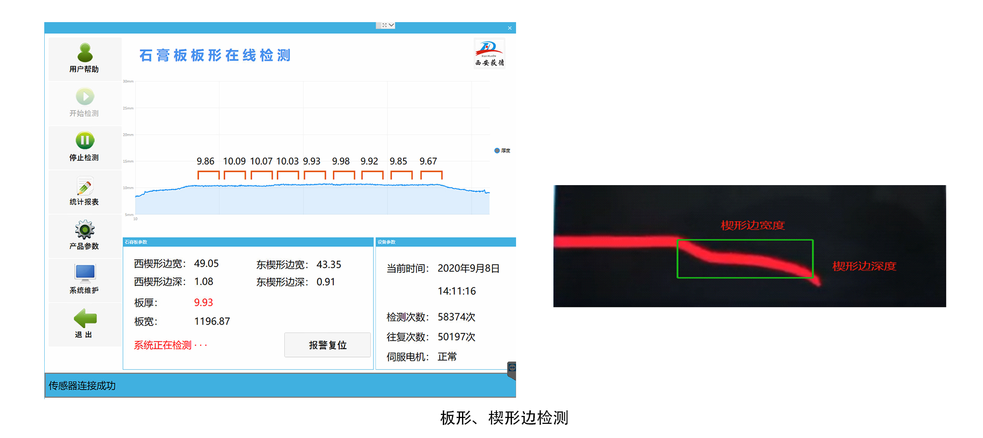 石膏板板形檢測系統:可檢測石膏板寬度、厚度、楔形邊寬度、楔形邊深度、板長、對角線等。